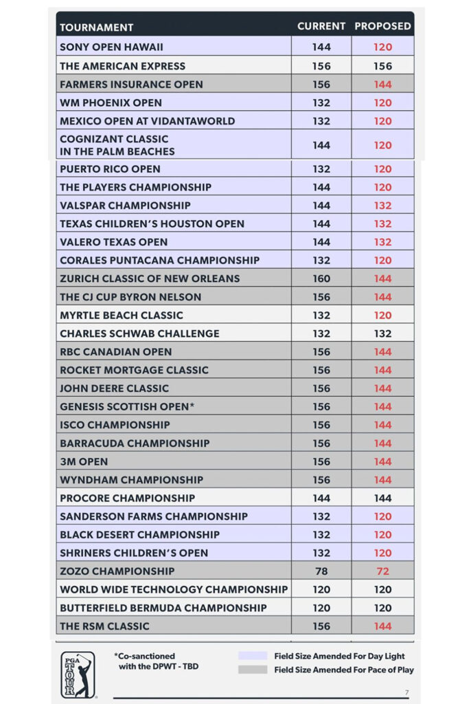 The starting point for the proposed changes stemmed from a desire to reduce the field size of tournaments throughout the calendar year. The proposal creates a new maximum field size for a one-course full-field event at 144 players (down from the current 156), but that number can be reduced to 132 or even 120 depending on considerations like daylight. The Players Championship, for instance, would see its field reduced from 144 players to 120, a decrease of almost 17 percent. There was discussion about increasing the field sizes in signature events to offset these reductions, but ultimately no change was made, with a minimum field size already in place of 72.