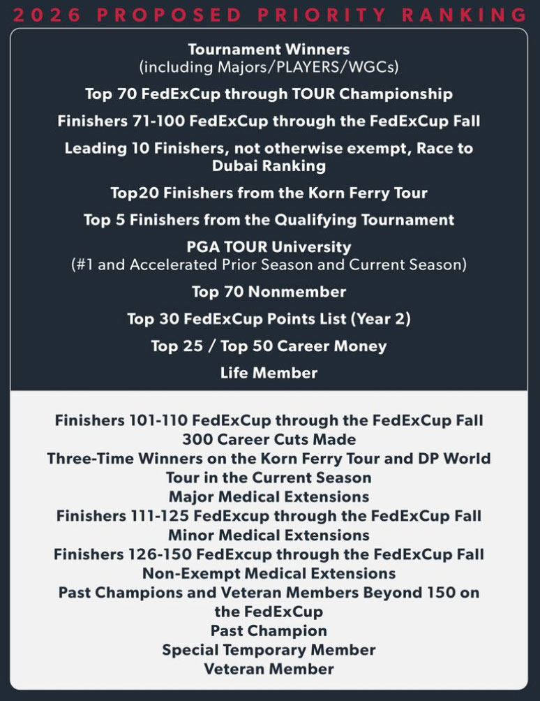 Additionally, “restricted sponsor’s exemptions”—two for tour members and two for DP World Tour/KFT/Q-School members—will be reallocated to the priority ranking of tour members. Tournaments would keep their four unrestricted exemptions.